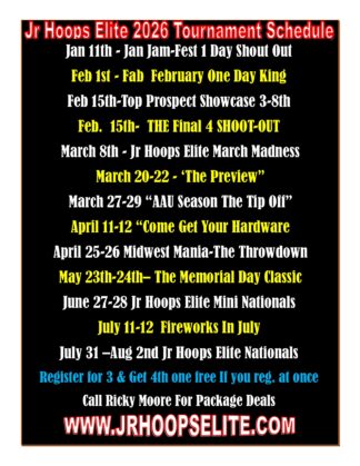 2026 Event Calendar & Tourney Series Schedule JR HOOPS ELITE TOURNEY SERIES. CALL FOR 3, 4 & 5 Tournament Packages.. Great Deals & Money Back Guarantee!! [wp_paypal_payment]
